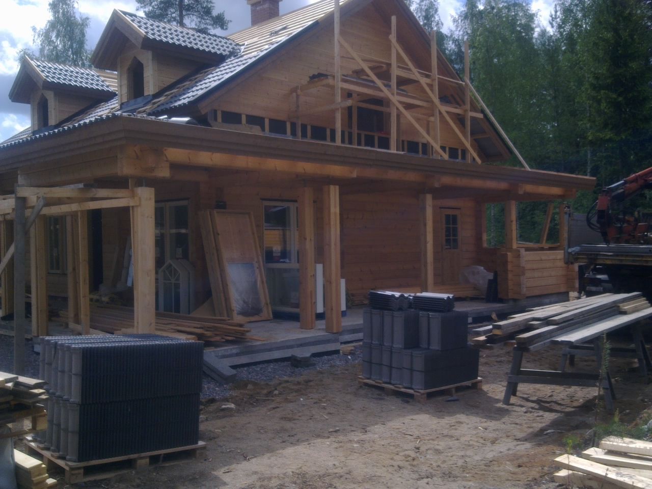 Hirsien, liimapalkkien sekä kattoristikoiden asennus hoituu nosturiautolla (44 tm:n nosturi 22 metrin ulottuvuudella).